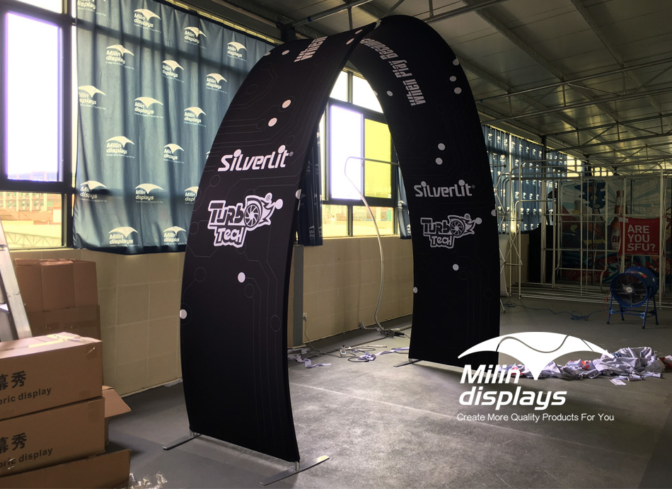 Arch Tension Fabric Display Kit are the latest portable booths on the market for tradeshows, Utilizing an interlocking pole system and full-color, dye-sublimated fabric graphic that is able to slide over the frame like a pillowcase, you will find set up to be a breeze and tear down just as easy.